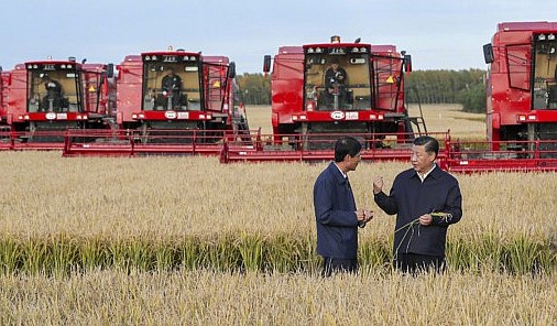 習(xí)近平來(lái)到黑龍江省撫遠(yuǎn)市玖成水稻種植專(zhuān)業(yè)合作社,了解合作社土地流轉(zhuǎn)和采用先進(jìn)種植技術(shù)提高水稻產(chǎn)量效益等情況。(圖片來(lái)源:新華視點(diǎn))