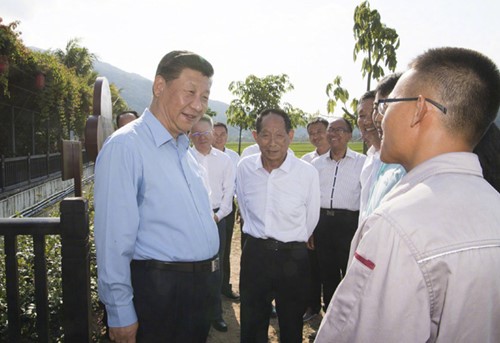 2015年7月16日下午,習(xí)近平來(lái)到了光東村。進(jìn)村前,經(jīng)過(guò)一大片水稻田時(shí),總書(shū)記下車(chē),沿著泥濘的田埂走進(jìn)田里,同正在田間勞作的村民和農(nóng)技人員攀談起來(lái)。