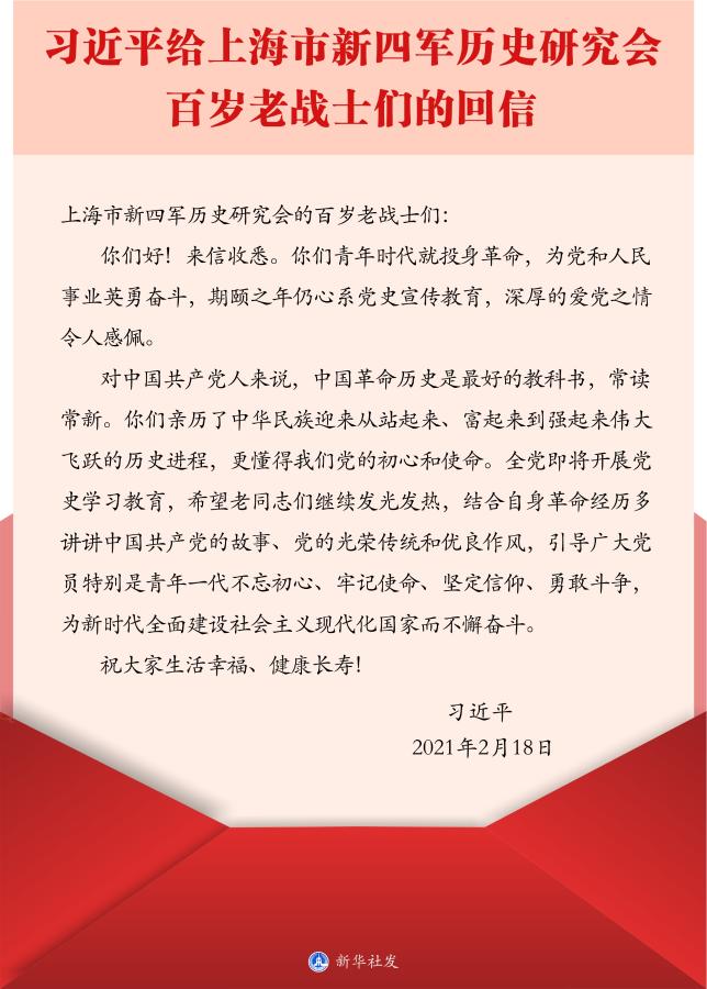 圖表:習(xí)近平給上海市新四軍歷史研究會(huì)百歲老戰(zhàn)士們的回信 新華社發(fā)
